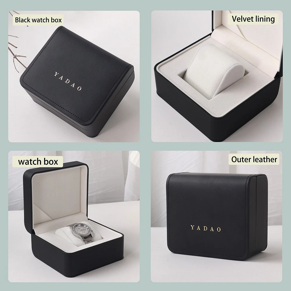 Echt leer, zwarte buitenkant, fluwelen binnenkant, hoogwaardige stijlvolle horlogeverpakking, displaydoos